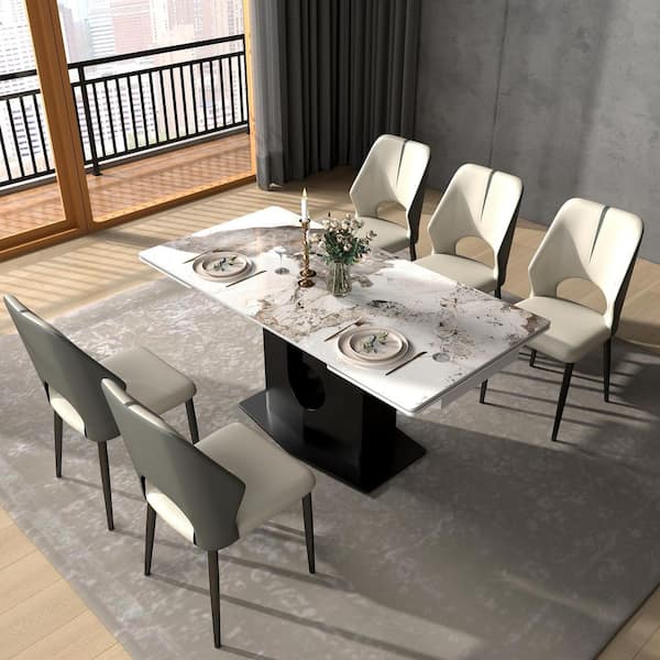 Pandora Marble Top 94.48 in. Pedestal Extendable Dining Table Seats 10+ with Electroplated Stainless Steel Base