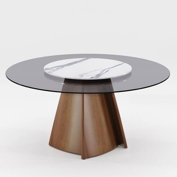 Round Brown With Lazy Turntable Glass 53.15 in. Pedestal Dining Table with Wood Base (Seats 6)