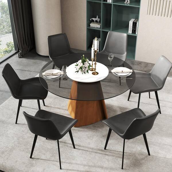 Round Brown With Lazy Turntable Glass 59.05 in. Pedestal Dining Table with Unique Wood Base Seats 8