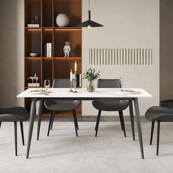White Rectangle Sintered Stone Marble 62.99 in. Pedestal Dining Table Seats 6 with Metal Gray Legs