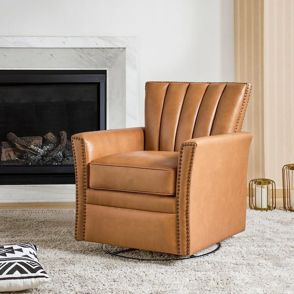 Adela 30 in. Camel Genuine Leather Swivel Rocking Arm Chair with Nailhead Trim