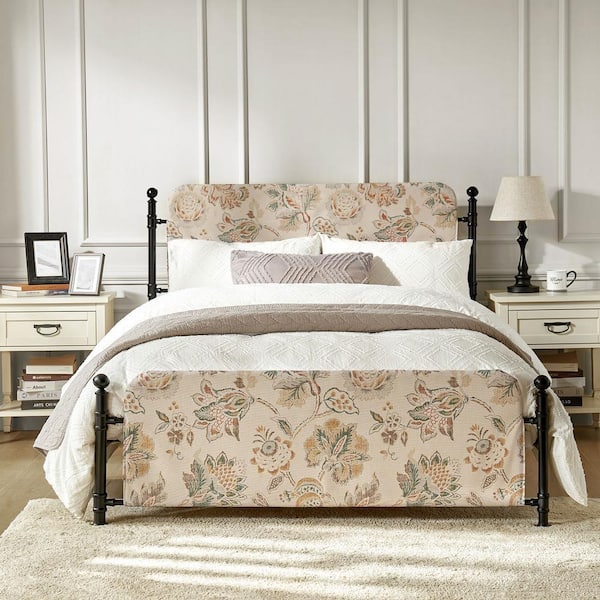 Baltazar Beige Transitional 61.75 in. Metal Frame Platform Bed with Floral Upholstered