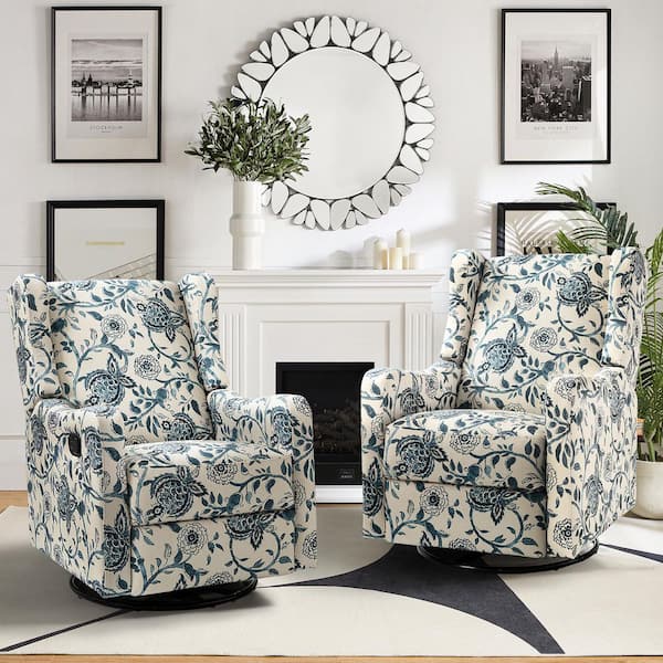 Bernd Transitional Floral Wingback Manual Swivel Rocker Recliner with Metal Base set of 2 - Blue