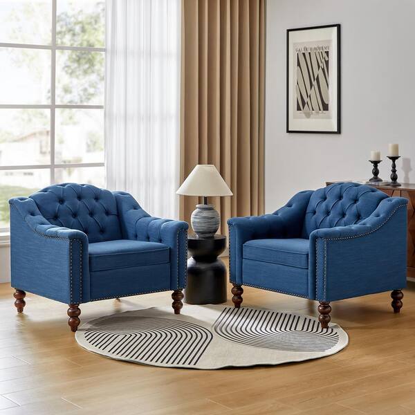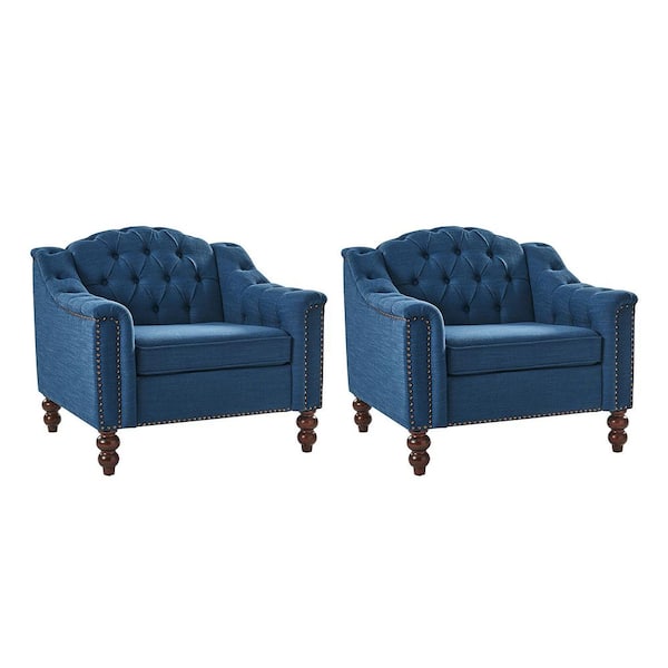 Carmen Indigo Button-Tufted Accent Chair Set of 2 with Solid Wood Legs