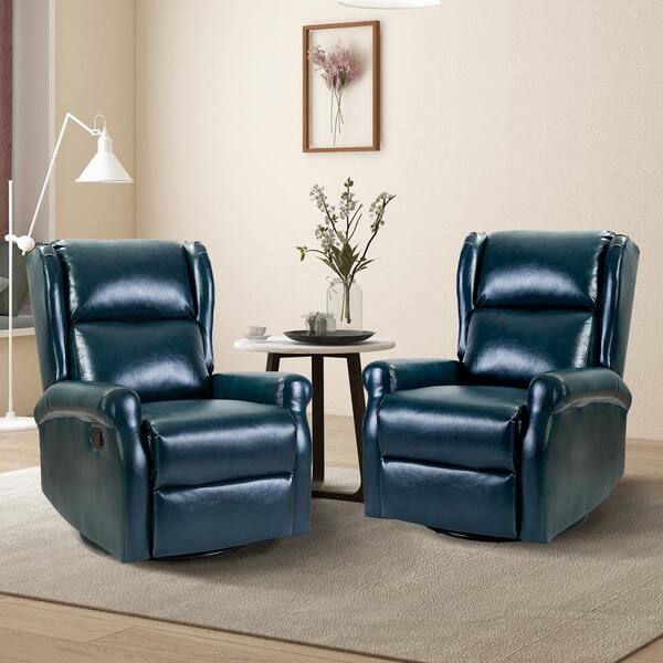 Chiang Turquoise Contemporary Wingback Leather Manual Swivel Recliner Rocking Nursery Chair Set with Metal Base Set of 2