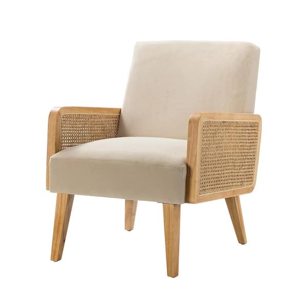 Delphine Modern Tan Accent Arm Chair with Rattan Armrest and Wood Legs for Living Room and Bedroom