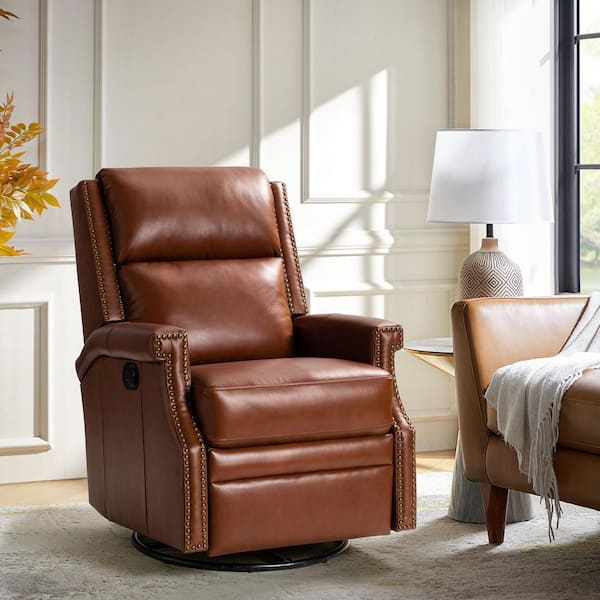 Dryope Brown Genuine Leather Swivel Rocker Recliner with Nailhead Trim