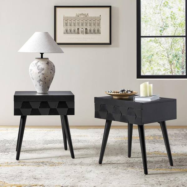 Edelmira 22 in Black MDF Hexagon End Table with Charging Station Set of 2