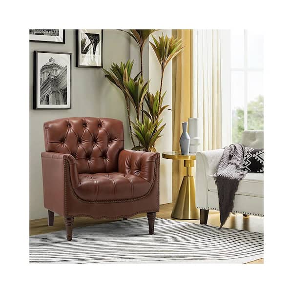 Elijah 32 in. Traditional Brown Button-Tufted Genuine Leather Arm Chair with Solid Wood Legs
