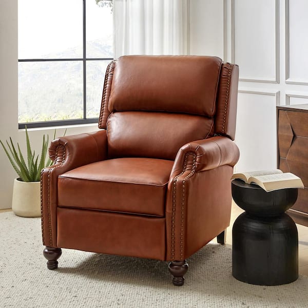 Elisabete Mid-century Modern Retro Brown Nail Head Trim Genuine Leather Cigar Recliner with Tapered Birch Wood Legs