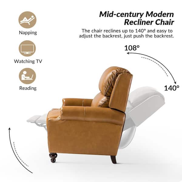 Elisabete Mid-century Modern Retro Camel Nail Head Trim Genuine Leather Cigar Recliner with Tapered Birch Wood Legs