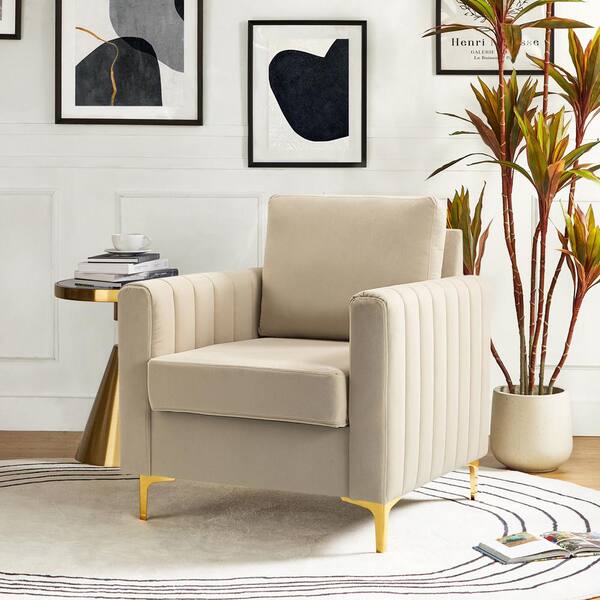 Ennomus Tan Velvet Cushion Back Club Chair Arm Chair with Golden Metal Legs and Track Arms