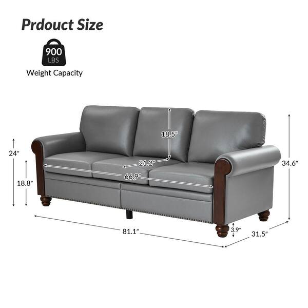 Felipe Transitional 81.1 in. W 3-Seat Faux Leather Sofa with Solid Wood Legs in Grey