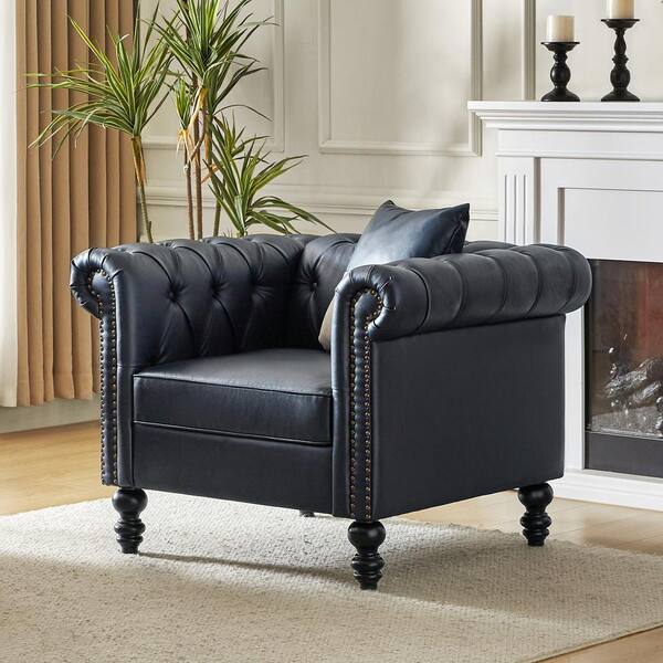Felisa Navy Leather Nail Head Armchair with Solid Wood Legs
