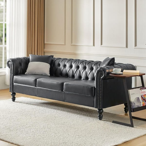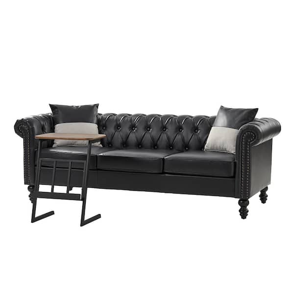 Felisa Traditional 84.5" Wide Button-tufted Leather Sofa with End Table and Gourd-shaped Solid Wood Legs-Black