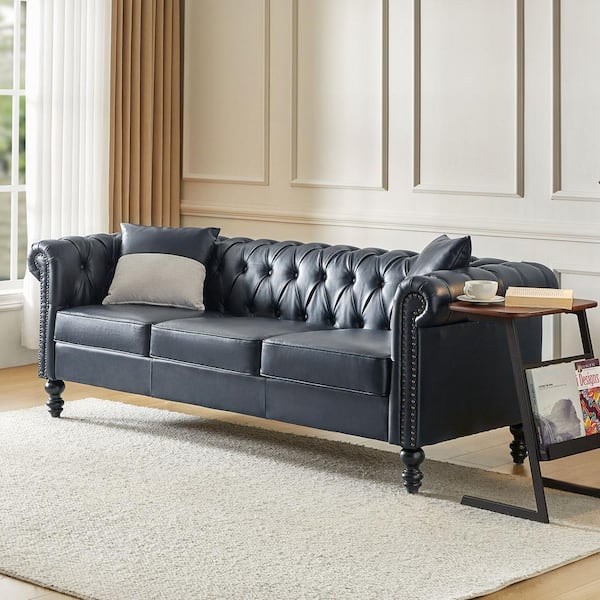 Felisa Traditional 84.5" Wide Button-tufted Leather Sofa with End Table and Gourd-shaped Solid Wood Legs-Navy