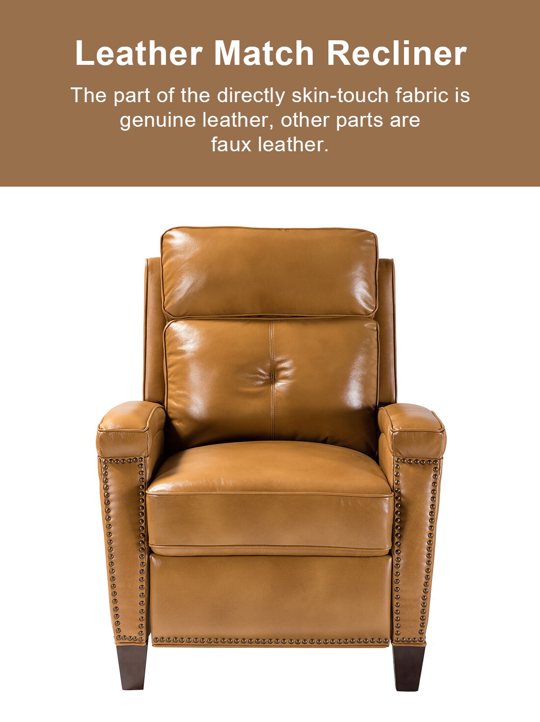 This recliner is perfect for relaxing in style. Upholstered in genuine leather, it exudes luxury and comfort, with a sleek and sophisticated design that complements any room. Crafted from solid and manufactured wood, it features solid wood mid-century modern legs and glamorous nailhead trim. The tufted headrest and backrest add visual appeal, while the easy-to-use reclining function ensures long-term comfort for TV viewing or relaxing. Ideal for living rooms, media rooms, and master bedrooms.