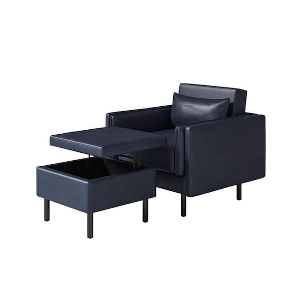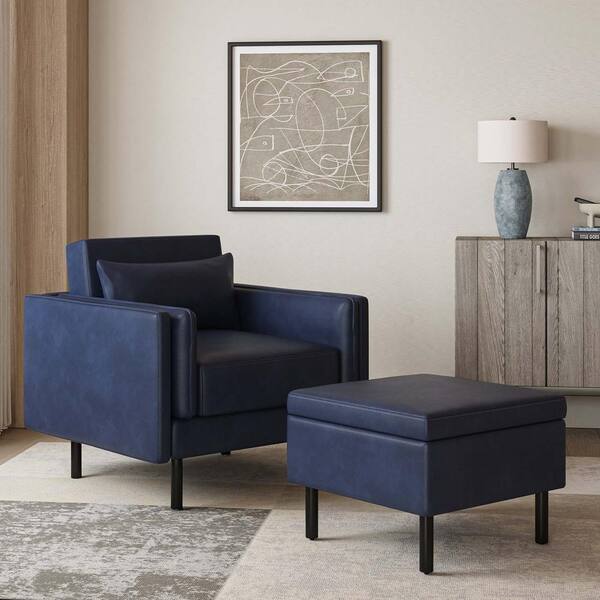 Harald Navy Modern Leather 35" Wide Armchair with Lift-top Storage Ottoman