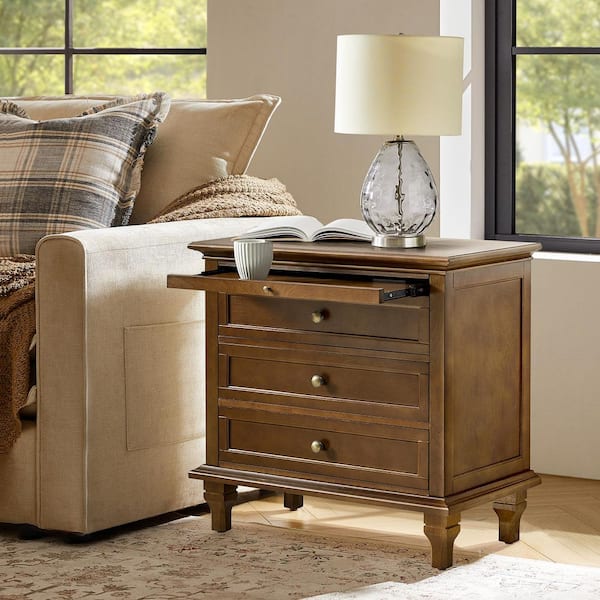 Julia Walnut 27 in. H Traditional 3-Drawer Solid Wood Legs Nightstand with Charging Station