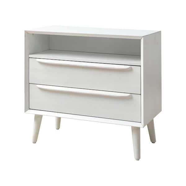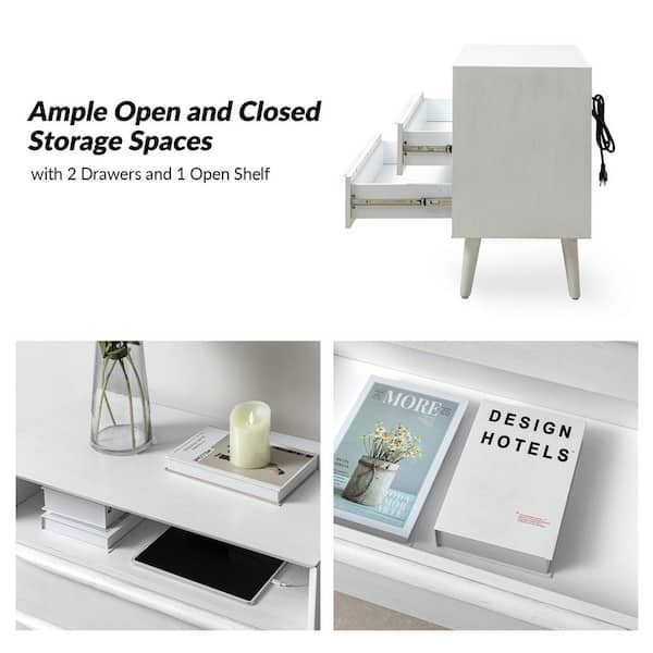 Leslie Mid-Century Modern White 2-Drawer Nightstand with Built-In Outlets