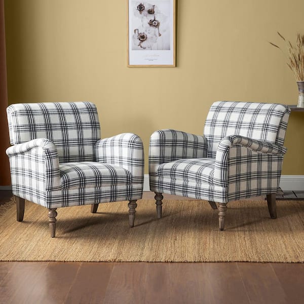 Mandan Black Contemporary and Classic Upholstered Plaid Pattern Accent Armchair with Turned Solid Wood Legs Set of 2