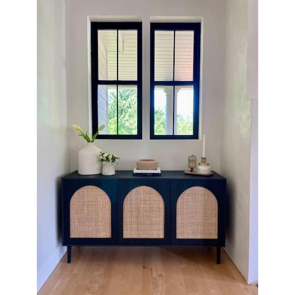Mercury Contemporary 56 in. Wide Rattan 3-Doors Oak Storage Sideboard with adjustable legs and Shelves-Black