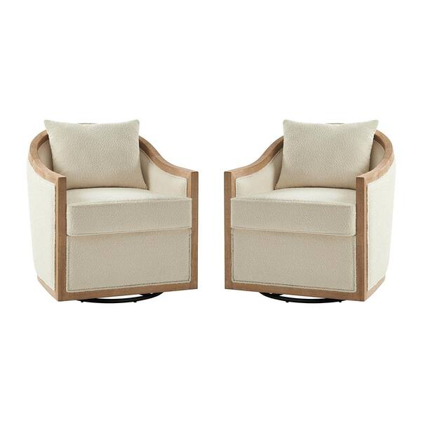 Oscar Jess Farmhouse Solid Wood Edging Swivel Barrel Chair Set of 2 with Toss Pillows-Ivory