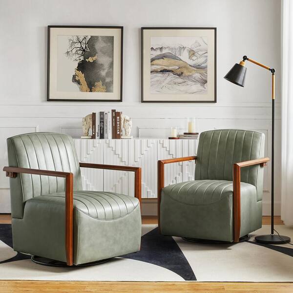 Pedro Sage Genuine Leather Swivel Chair Set of 2 with Wooden Arms
