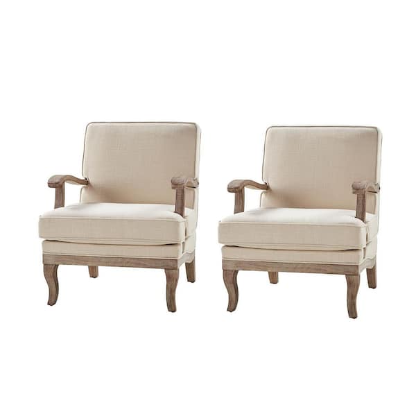 Quentin Linen Farmhouse Wooden Upholstered Arm Chair with Wooden Legs and Foot Pads Protecting the Floor (Set of 2)