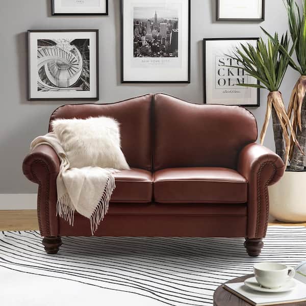 Rafael Brown 60 in. Wide Genuine Leather Rolled Sofa with Nail head Trims