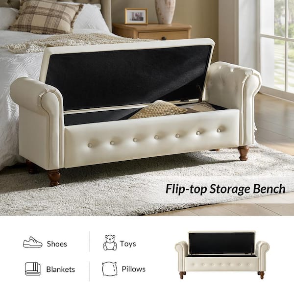 Sandra Ivory 63 in. W Upholstered Storage Bedroom Bench with Solid Wood Legs