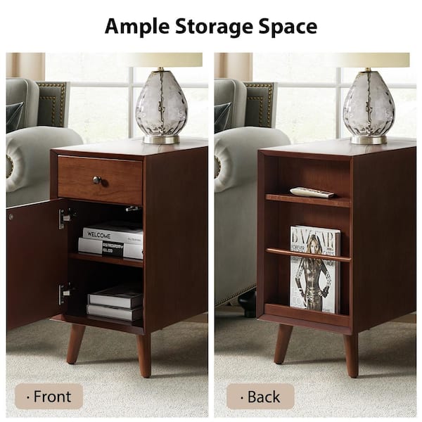 Teodor Walnut 14 in. W Mid-Century Modern Rectangle MDF End Table with Storage and Built-in Outlets