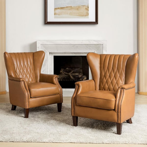 Valerius Camel Genuine Leather Armchair with Nailhead Trims and Solid Wood Legs (Set of 2)