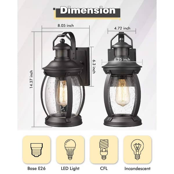 1-Light Black Motion Sensing Non Solar LED Outdoor with Seeded Glass Shade Wall Lantern Sconce Light