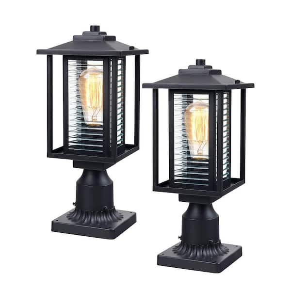 1-Light Black Outdoor Post Lantern with Ribbed Glass (2-Pack)