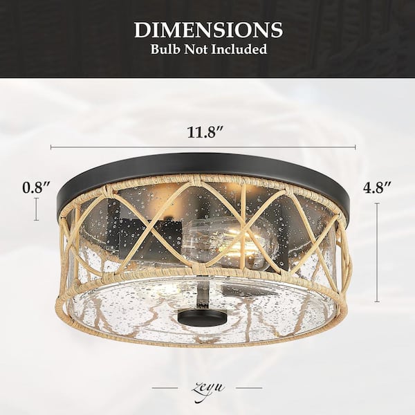 12 in. 2-Light Black Rattan Modern Flush Mount with Seeded Glass Shade and No Bulbs Included 1-Pack