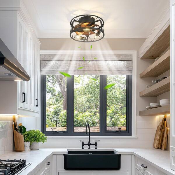 12 in. indoor Matte Black and Dark Wood 100-240-Volt Low Profile Mini Cage Ceiling Fan with Light