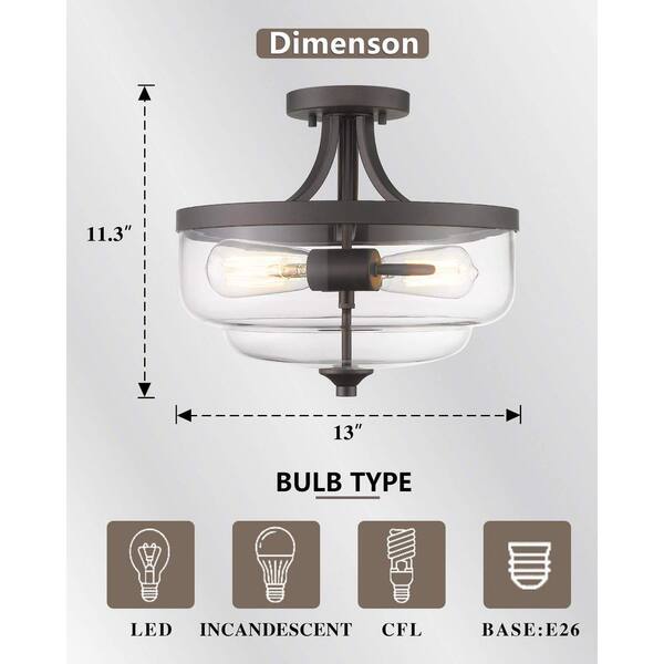13 in. 2-Light Oil Rubbed Bronze Finish with Clear Glass Shade Semi Flush Mount ‎Ceiling Light
