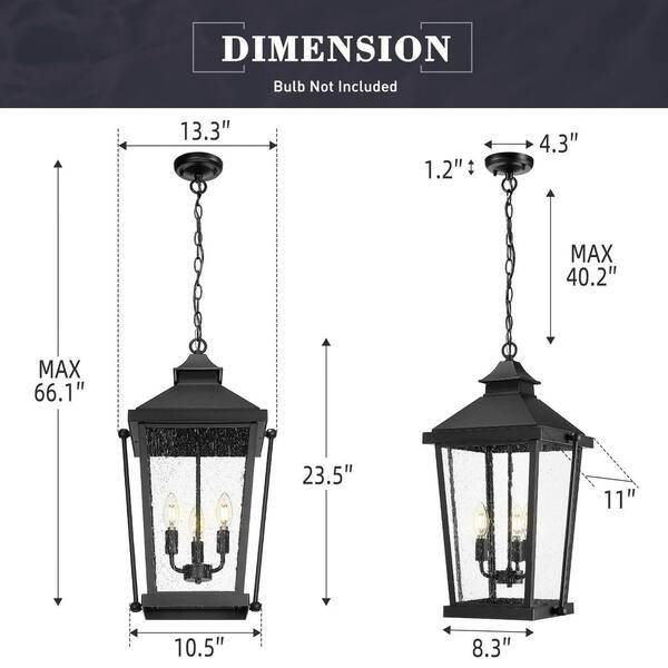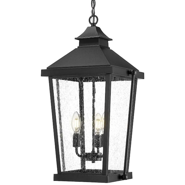 14 in. 3-light Black Finish Outdoor Pendant Light with Seeded Glass and No Bulbs Included
