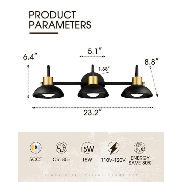 15W 5CCT LED Dimmable 23.2 in. 3 Light Black Gold Finish Bathroom Lights Over Mirror LED Vanity Light with Metal Shade