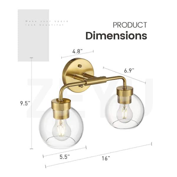 16 in. 2 Light Brushed Gold Vanity Light with Clear Glass Shade