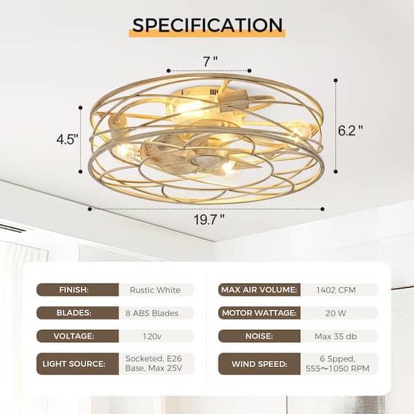 20 in. Indoor White and Golden 100-240 V Low Profile Cage Ceiling Fan with Light