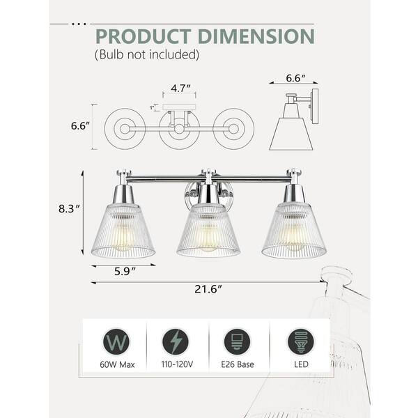 22 in. 3-Light Chrome Vanity Light with Fluted Glass Shade