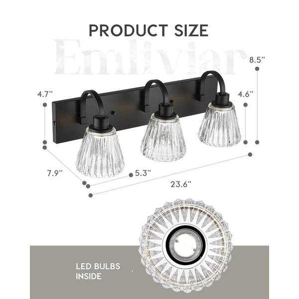 23 in. 3 Light Black LED Vanity Light with Fluted Ripple Glass