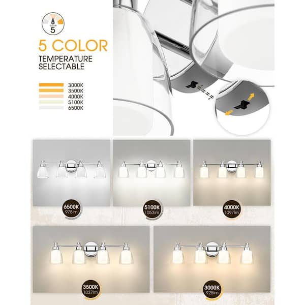 28.4 in. 4-Light Chrome Modern 15W LED Vanity Light with Clear Frosted Glass Shade