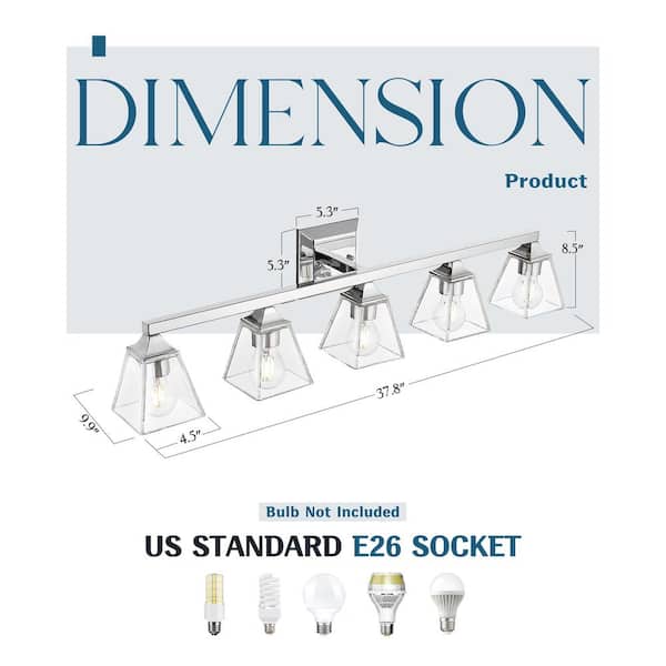 37.8 in. 5-Light Chrome Vanity Light Over Mirror with Clear Glass Shade