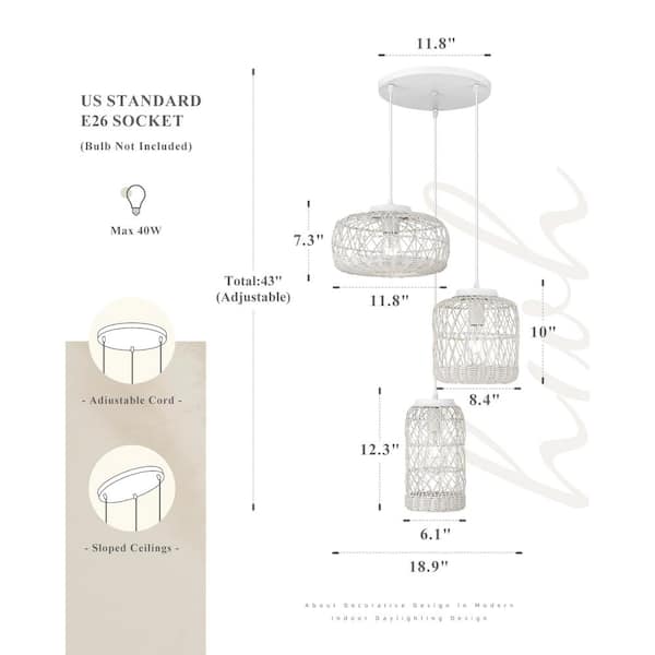 40-Watt 3-Light Boho Cluster White Pendant Light with Hand Oven Rattan Shade, No Bulbs Included