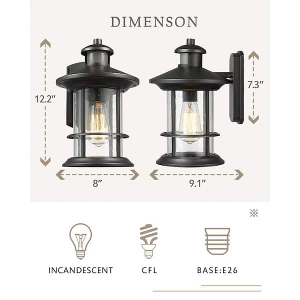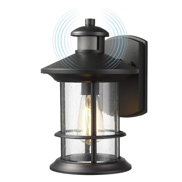 Black Motion Sensing Dusk to Dawn Outdoor Hardwired Wall Lantern Scone with Seeded Glass