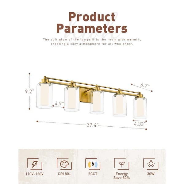 Modern 37.4 in. 5 Light Brushed Gold 30W 5CCT LED Vanity Light with Frosted Acrylic Shade