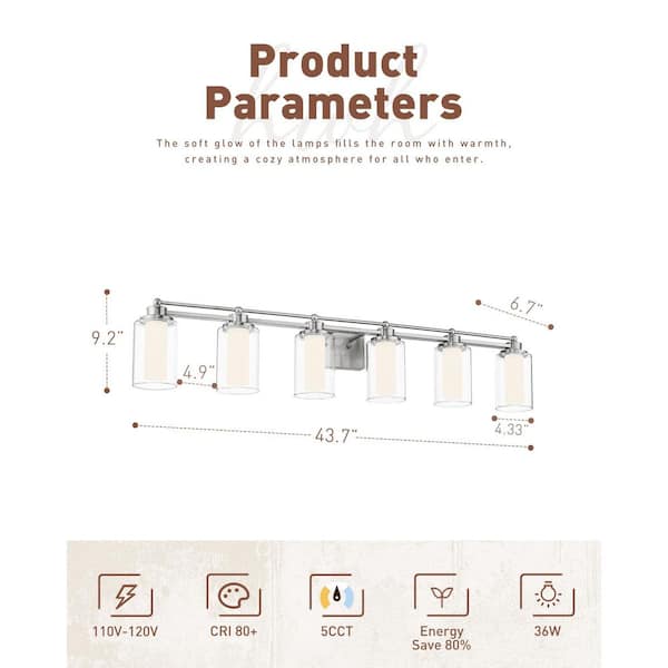 Modern 42.7 in. 6 Light Brushed Nickel 36W 5CCT LED Vanity Light with Frosted Acrylic Shade